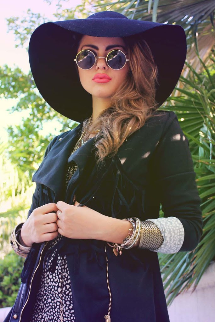 this combination is amazing. the hat and the sunglasses suits you so well. the dress is vbery pretty and I love the jewelry. the jacket is amazing.